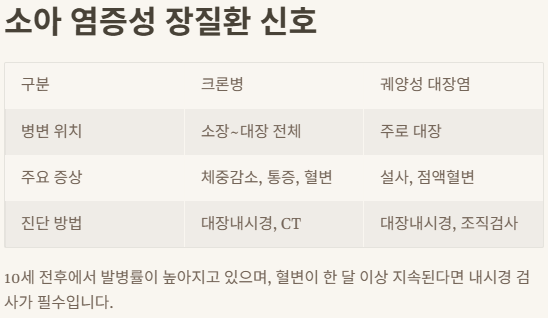 이는 단순한 장염이 아니라 **소아 염증성 장질환(IBD)**일 수 있습니다