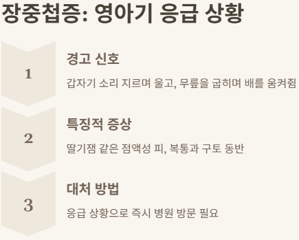 복통과 구토가 동반되며, 치료가 지연되면 장이 괴사될 수 있어