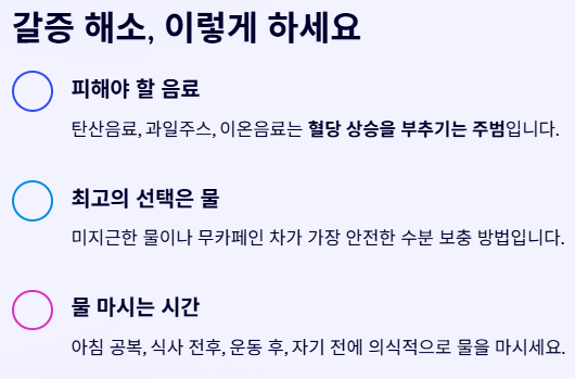 덥다고 해서 무심코 마시는 탄산음료, 과일주스, 이온음료... 당뇨 환자에게는 모두 혈당 상승을 부추기는 주범입니다. 단 음료를 마시면 혈당이 급상승하고, 이는 소변 배출량 증가 → 탈수 → 갈증 심화로 이어지는 악순환을 유발합니다.
