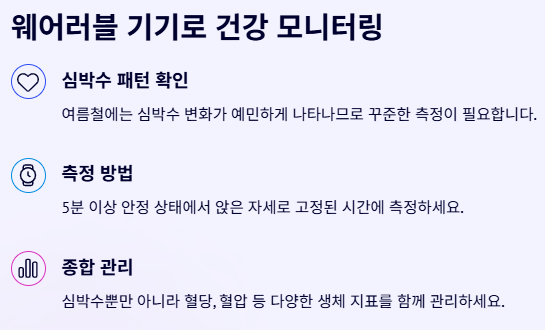 기온이 높은 여름철에는 심박수 변화도 예민하게 나타나므로 꾸준한 측정이 필요합니다. 웨어러블 기기를 활용하면 실시간으로 심박수 패턴을 모니터링할 수 있고, 이는 혈당 관리뿐 아니라 만성질환 조기 경고에도 도움이 됩니다.