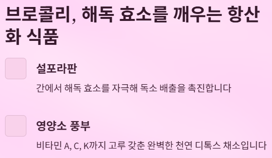 | 브로콜리 | 설포라판 | 간 해독 효소 자극 |