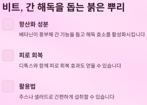 | 비트 | 간 해독, 항산화 | 주스, 샐러드 |