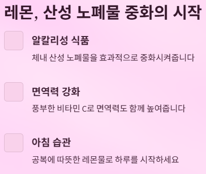 | 레몬 | 산성 중화, 피부 개선 | 따뜻한 물에 첨가 |